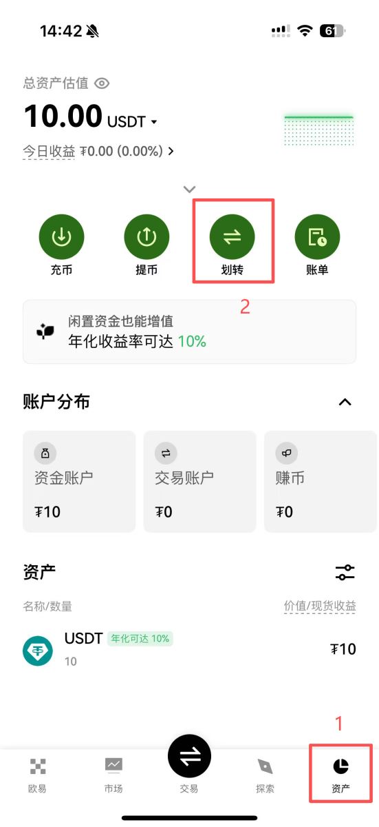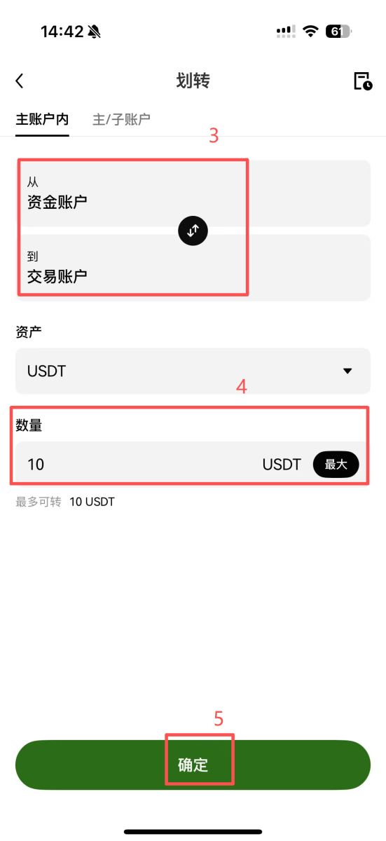 1.资金划转:在“资产”页面,选择“划转”,将USDT从“资金账户”全部转移到“交易账户”。