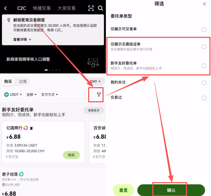 点击右上角的筛选(漏斗图标),开启“仅展示无需验证单”。这一步能帮你省去繁琐的商家二次验证流程。同时开启“新手友好委托单”,确保交易体验更顺畅。
