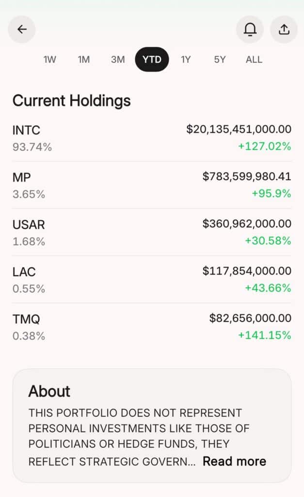 目前表现最佳的已披露投资组合与唐纳德·特朗普有关,其中重仓稀土矿业公司。总统在用“特朗普梗图代币”羞辱我们之后还能从中获利,这简直是在伤口上撒盐。