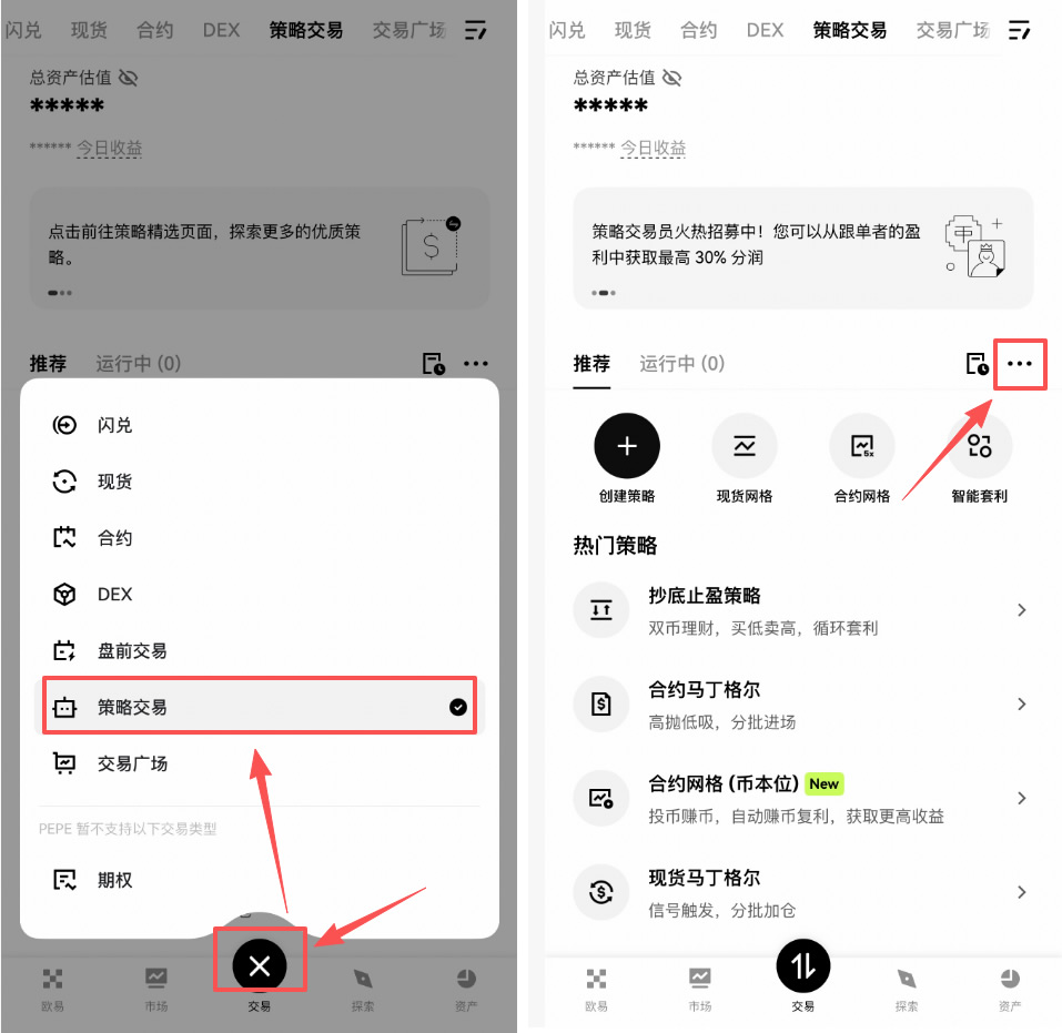 打开币安 App(官方注册 官方下载),点击底部的【交易】,进入页面后,选择【策略交易】首页,点击右上角【···】图标。