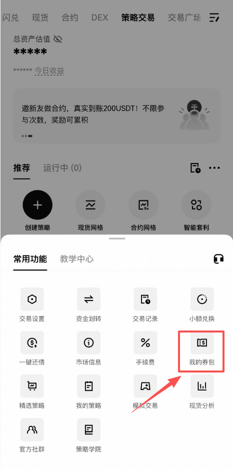 当您通过策略交易活动或者新人任务获得一张空投券后,可在券包处查看,券包入口:
