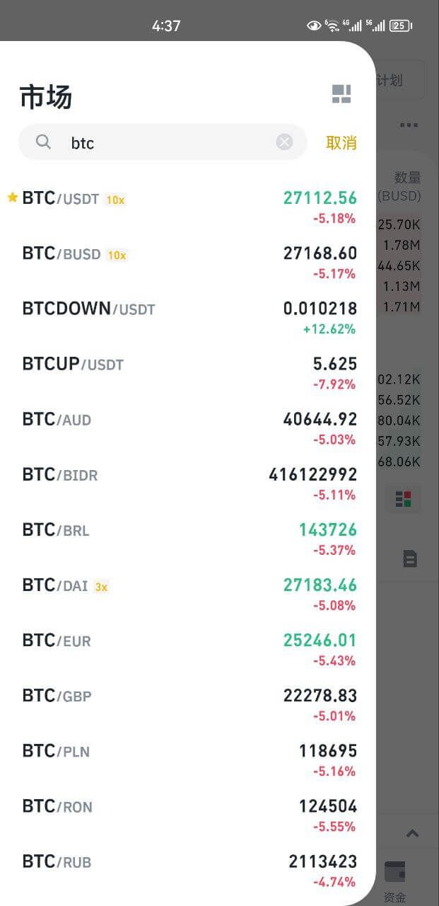 4、输入要购买的加密货币BTC,选择BTC/USDT交易对,第一个就是。