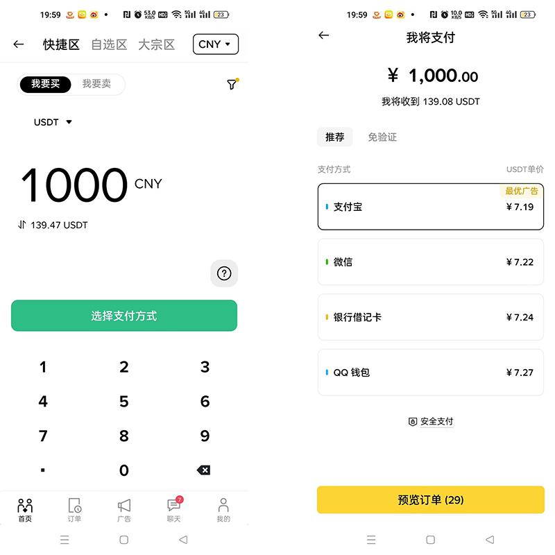 填写你要买入的金额,CNY指的是人民币,界面会有汇率说明,以下图为例,1000 人民币大概能购买139.47 USDT ,确定之后就选择支付方式,可以选择微信、支付宝或者银行卡的方式付款,不同的支付方式的汇率都会有差别,金额小无所谓,金额较大的话,尽可能在自选区选择汇率更好的商家。
