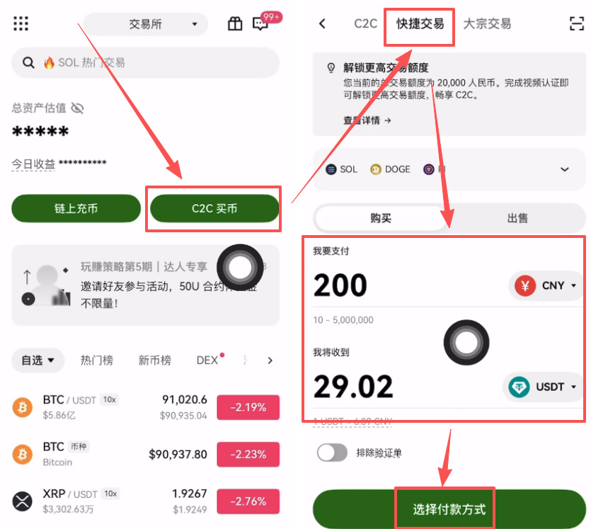 在binanceApp(官方注册 官方下载)首页,点击“C2C买币”,直接使用它的“快捷买币”,输入你想购买的金额(例如200元人民币),系统会自动计算出你能收到的USDT数量。