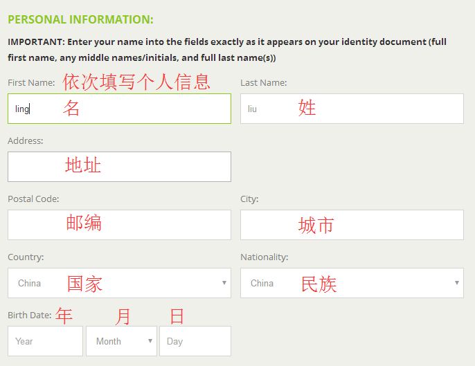 First Name:名字,填写拼音即可,比如“张三丰”就写 Sanfeng,注意大小写;