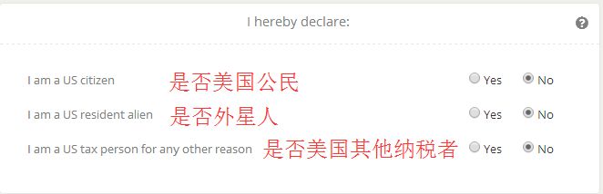 I hereby declare:声明,是否是 1 美国人、2 美国居民、3 向美国纳税的纳税人,如果不是就勾选 NO