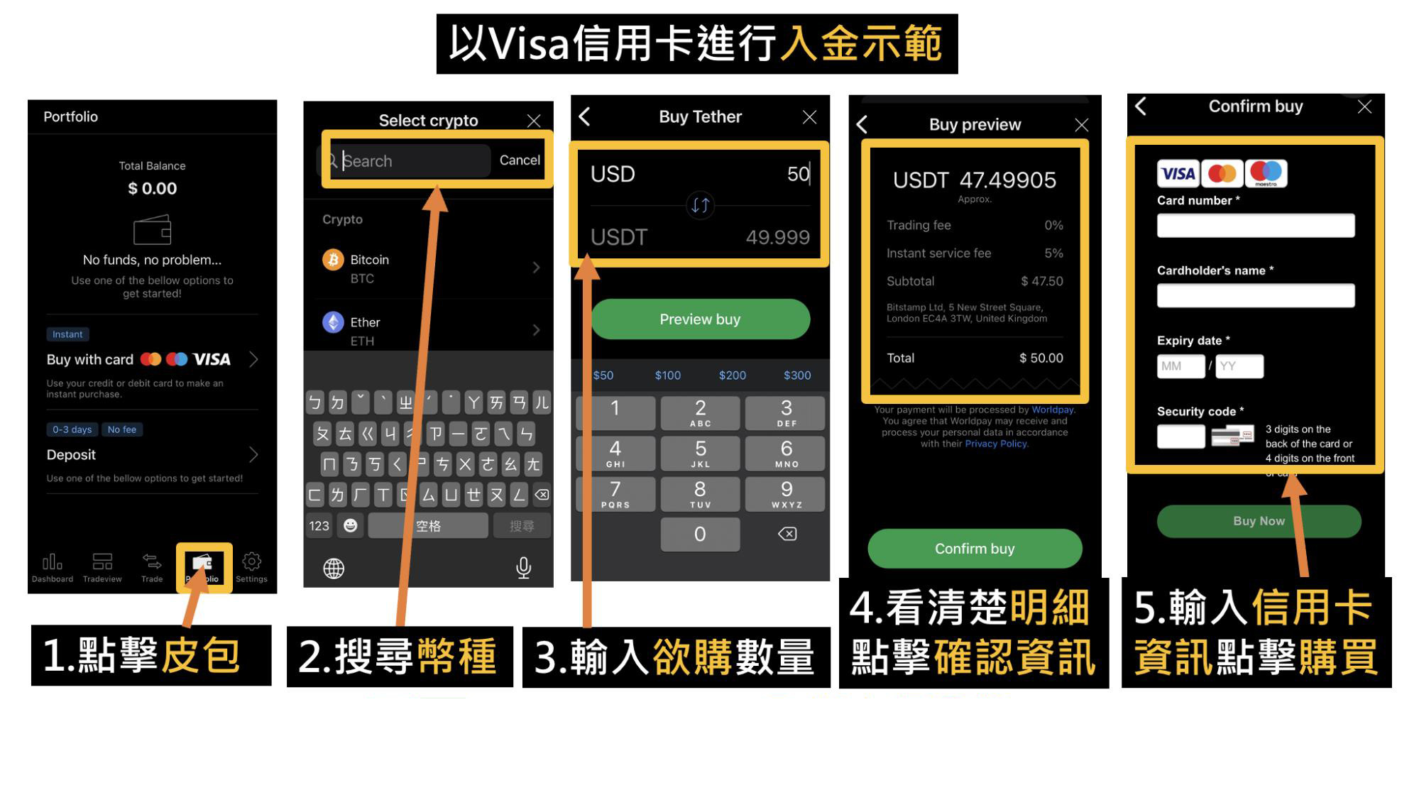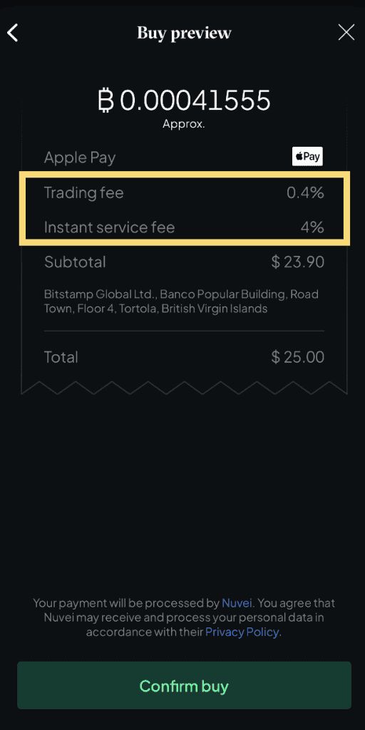 Bitstamp无法用台币直接入金,有支援ApplePay可以刷美金,但手续费挺高的(4.4%),最低要买25USD。