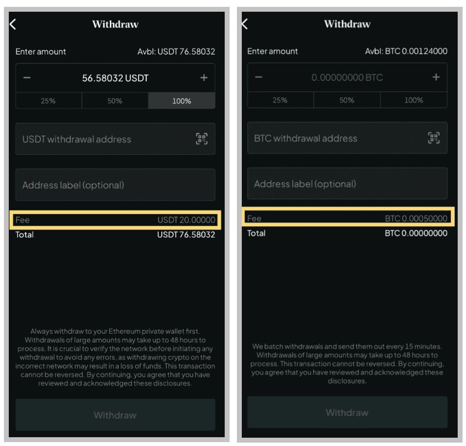我实际用下来提领USDT,一次要收20 U, 提领BTC的手续费也很惊人,要收0.0005BTC。