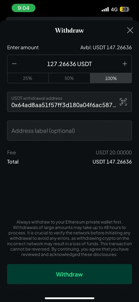 它还有另一个设计让我觉得很不直觉。在使用Bitstamp提领USDT时,只能贴地址,没办法选网路,好险我后来发现,它们只有在最下方段小小的一段文字里面提到,他们是自动使用Ethereum(ERC20)。