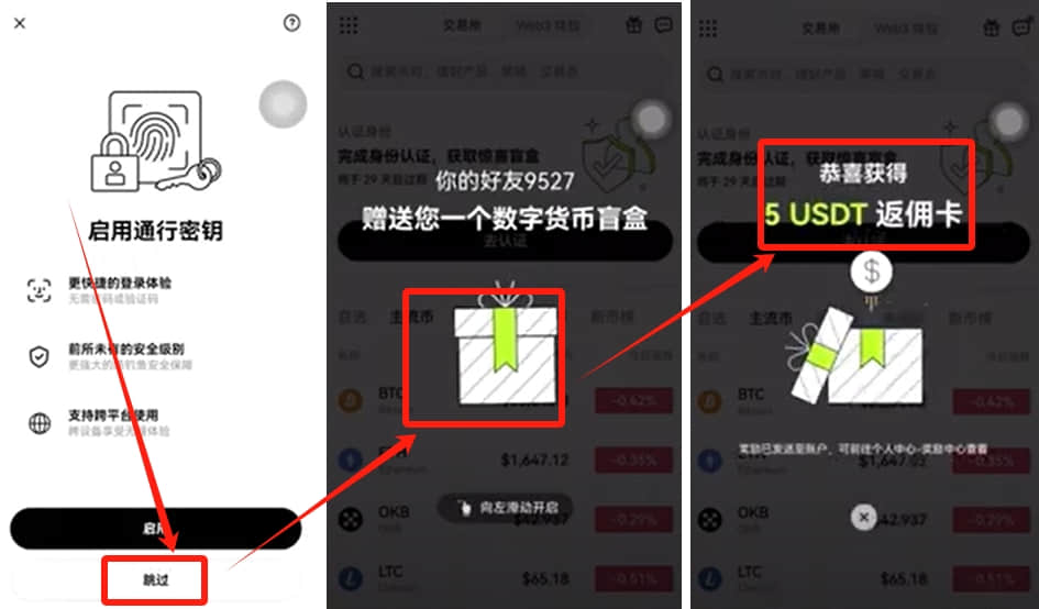 这个时候我们就已经登录到我们的币安上。点击“跳过”。点击数字盲盒,开出来5U的返佣卡还是非常高的。