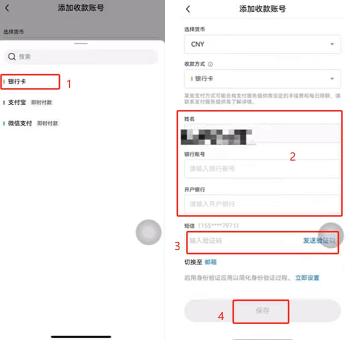 这里有银行卡、支付宝、微信都有。我们选择“银行卡”,输入账号和开户行,再接收一个验证码,点击【保存】。这时候就可以登记好你的银行卡了。