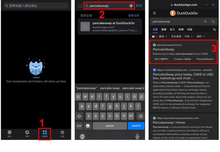 - 进入DeFi 网站。 Trust Wallet 使用DuckDuckGo 搜寻引擎,提供加密和无广告的搜寻结果,不会跟踪用户。
