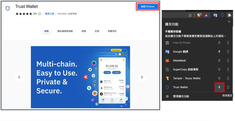 手机版本的Trust Wallet 钱包在安装后即可使用,而PC 版本浏览器插件在安装后可以在右上角的拼图处找到,你可以点击图钉图案将Trust Wallet 钱包固定起来。