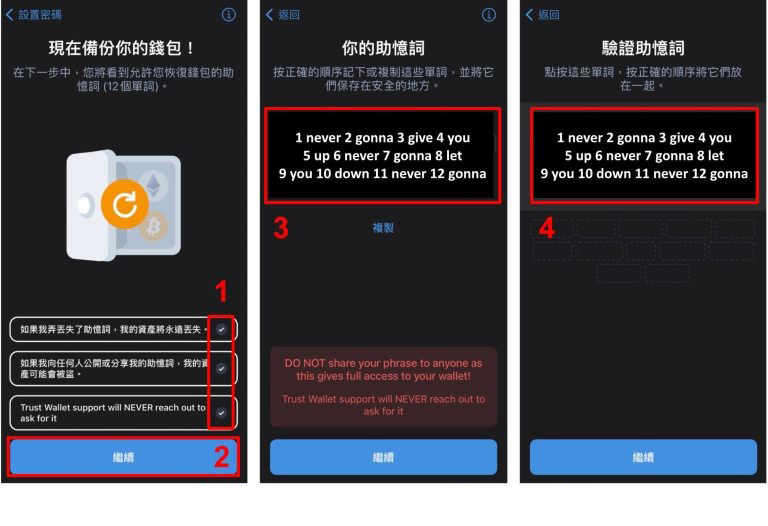 首先了解并勾选Trust Wallet 钱包的提示,这些很重要必须铭记于心,接下来就会显示你的注记词,请用纸笔或是更安全的方式保存起来,千万不要放在网路上例如云端硬碟之类的增加外泄风险,最后则是验证注记词,按照顺序填写确保你已经把钱包注记词记下来了。