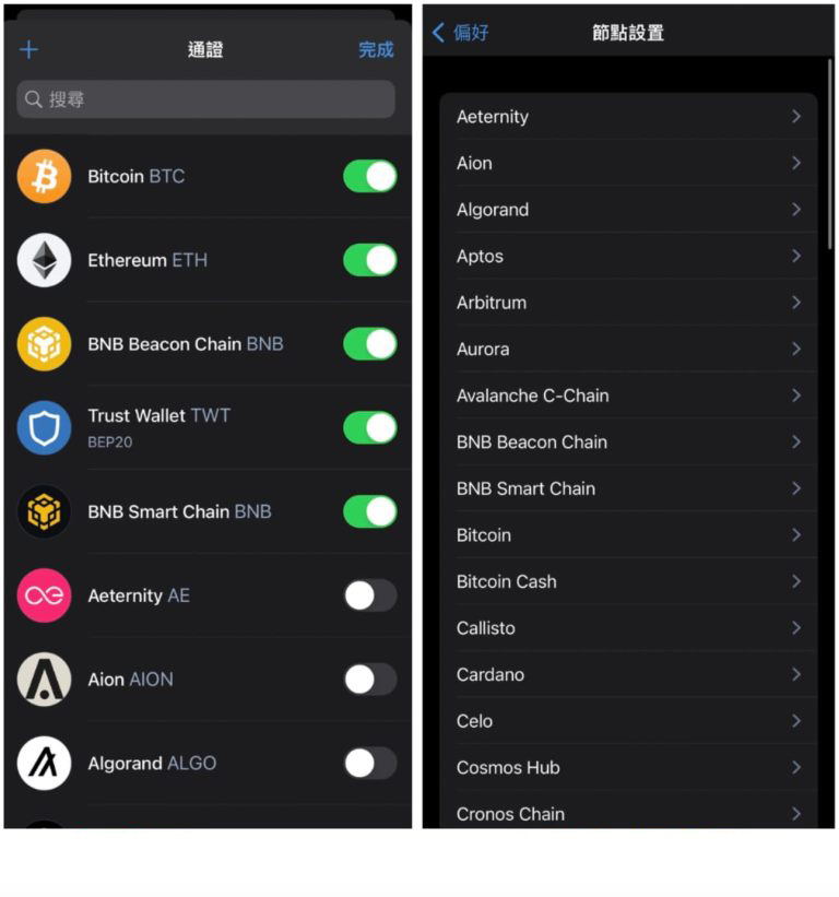 相较于MetaMask 小狐狸钱包新增币种需要自己去找出加密货币合约地址新增,Trust Wallet 钱包在新增币种与网路管理就相当贴心!