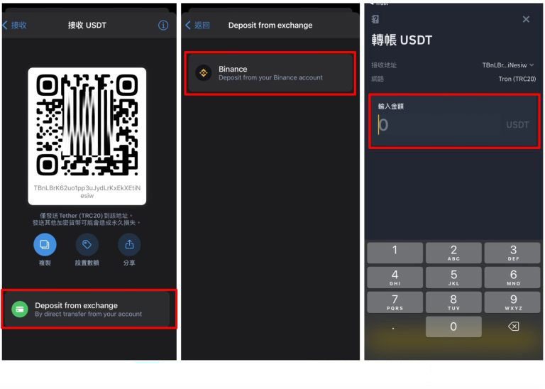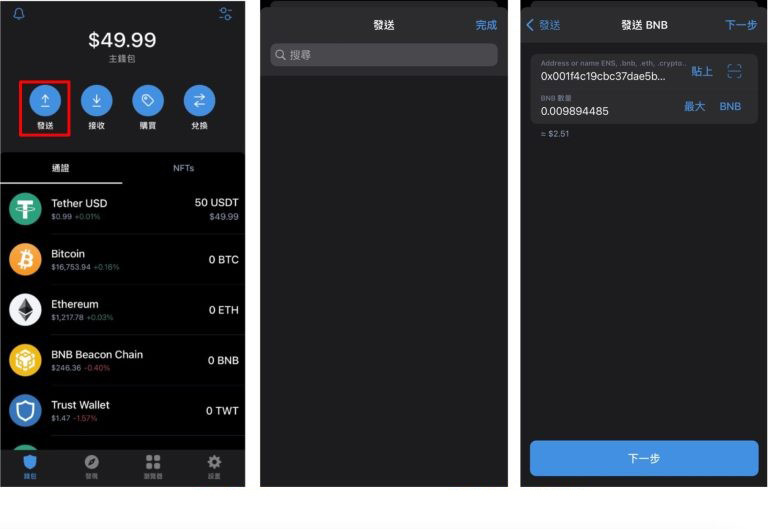 在币安交易所取得入金地址后,于Trust Wallet 点击发送,并选择转出USDT。