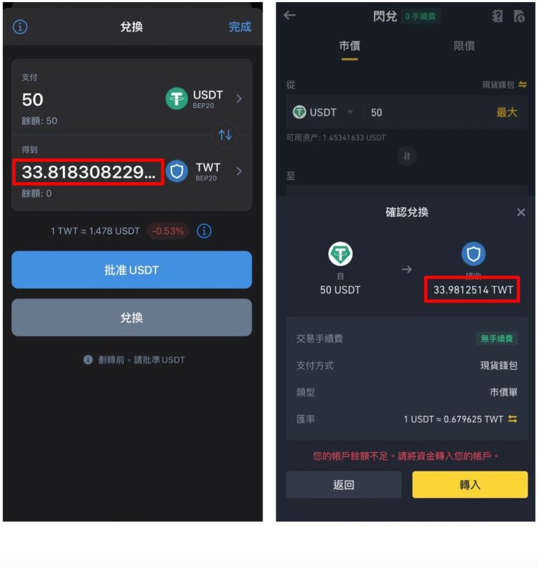 下面以50 USDT 所能购买到的BUSD 与TWT(Trust Wallet 平台币)做个表格来简单对比Trust Wallet 与币安交易所: