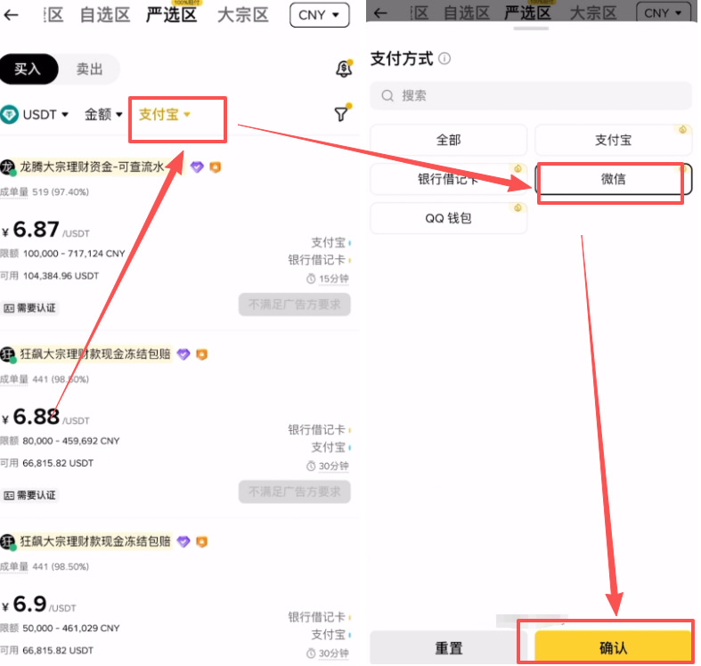 如果使用微信支付,流程类似:筛选“微信”支付方式 -> 挑选老商家 -> 下单添加好友。