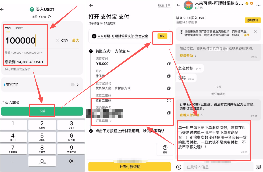 输入购买金额点击下单后,务必点击“聊天”窗口查看商家要求(通常要求实名付款)。 获取商家的支付宝账号或二维码,离开平台去支付宝转账。