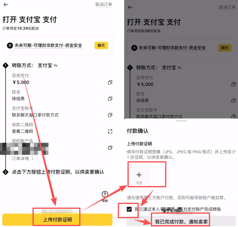 3、回到币安点击“上传付款证明”,上传截图并点击“我已完成付款,通知卖家”。