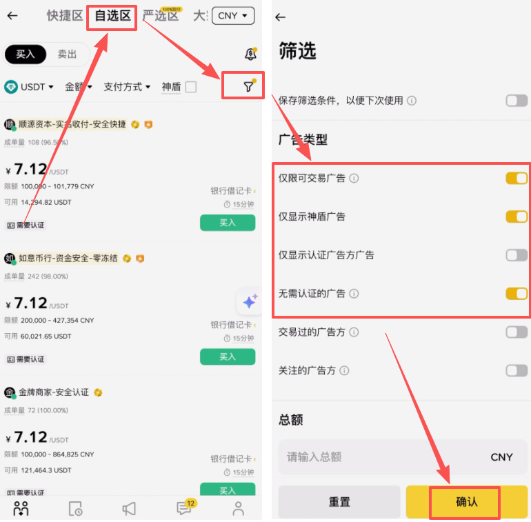 首先,我们点击右边这个小漏斗的图标,把“仅限可交易广告”打开,“仅显示神盾广告”打开,以及“无需认证的广告”打开。这样我们就可以找到那些既安全,交易又方便的商家。点击【确认】。