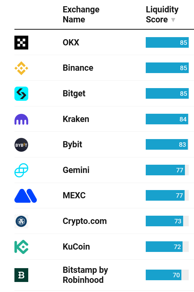 前段提过的Kaiko 在每季的交易所排名报告中有提供流动性评分: