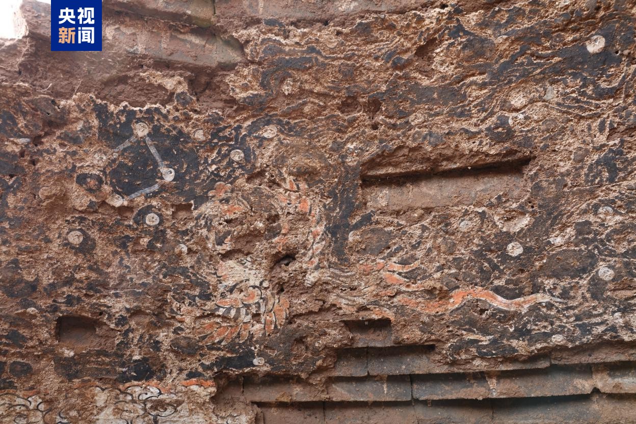 墓室顶部亦施壁画,因顶部坍塌、墙皮脱落壁画保存较差,靠近檐椽为一周云气纹,以墨线勾绘,上轮廓线填朱作分隔,再上绘四神与围绕其间的二十八宿,四神残见白虎、朱雀、玄武,分别对应西、南、北壁,星宿以白色圆点连线表示,可识别的有白虎附近的胃宿、朱雀附近的张宿、玄武附近的斗宿。