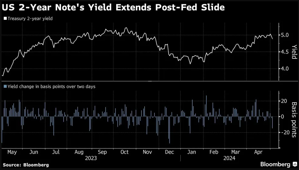 受鲍威尔的鸽派言论提振,短期美国国债过去两个交易日经历了自1月份以来最好的两天涨势。对利率最敏感的两年期美债收益率从周二5.04%的年内高点跌至4.87%,下跌了约17个基点。目前,债券交易员已将美联储首次降息的充分预期提前了一个月,至11月。