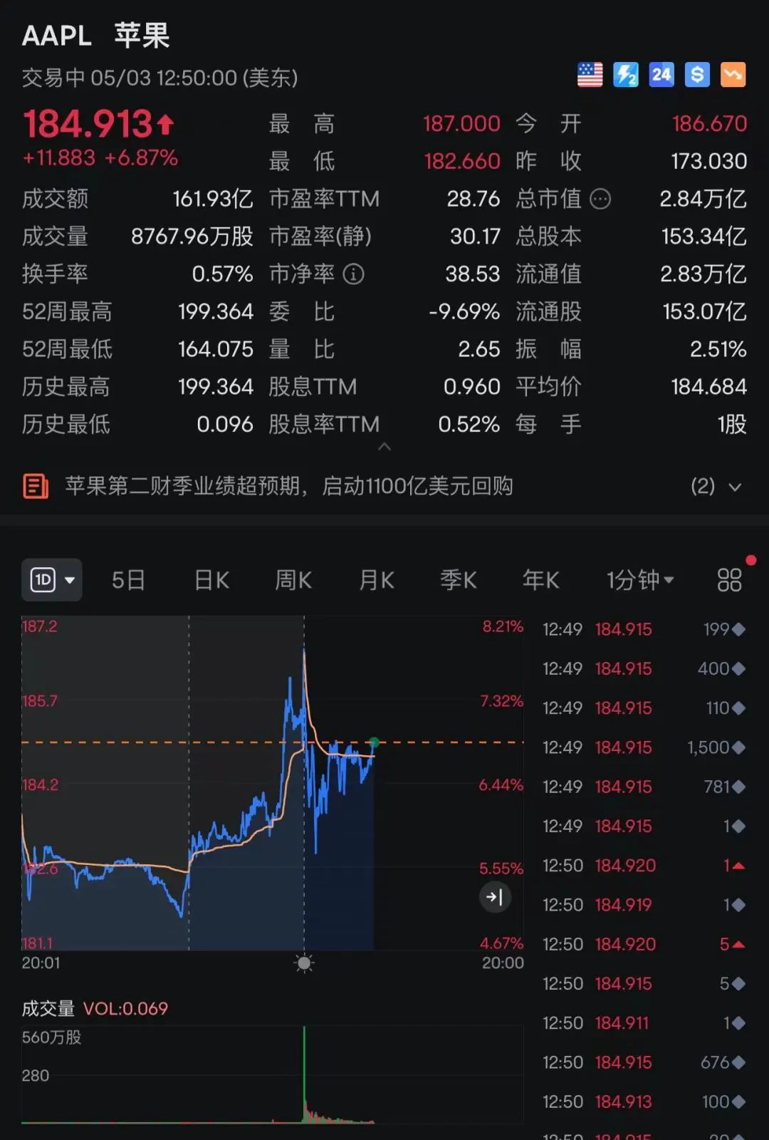 其中,苹果盘初一度大涨超8%,截至发稿时涨超6%。消息面上,苹果了宣布有史以来规模最大的股票回购计划——1100亿美元(接近8000亿元人民币),高于往常的900亿美元,同时将股息提高4%至每股25美分。股息将于5月16日派发给所有在5月13日收市时已登记在册的股东。