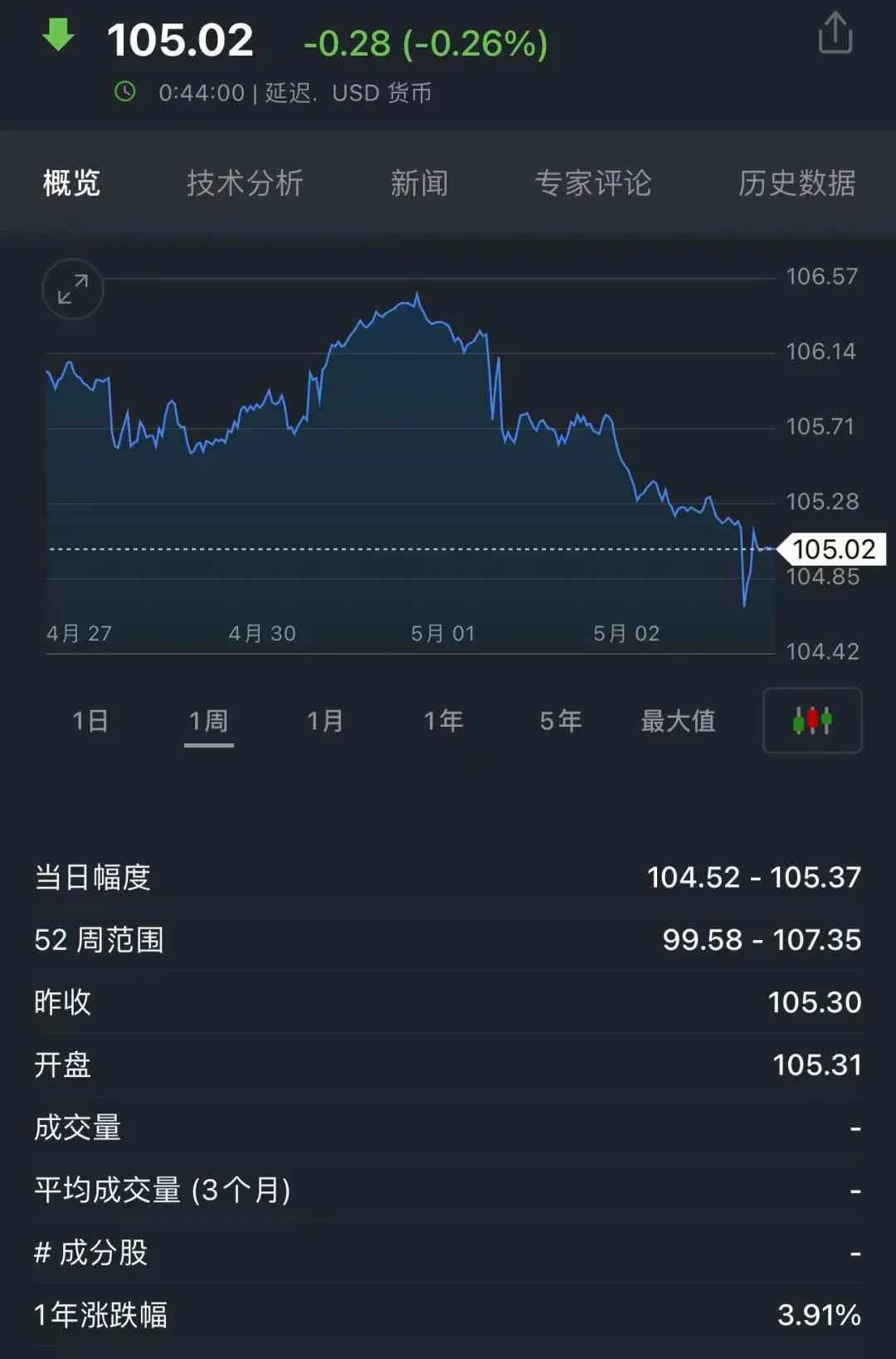 美国4月非农数据公布后,美元指数跳水,刷新4月10日以来的低点,最低报104.52,日内最大跌幅达0.76%,一度下跌78点。截至发稿,报105.02。
