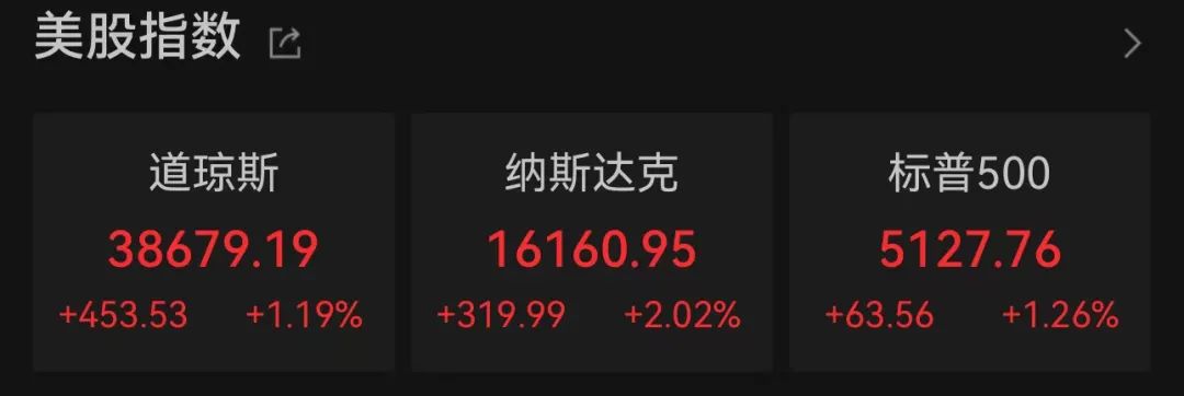 美股三大指数则全线上扬。截至发稿,道琼斯工业指数上涨453点,涨幅1.18%;纳斯达克综合指数涨2.02%,报16160.95点;标普500指数上涨1.26%,报5127.76点。