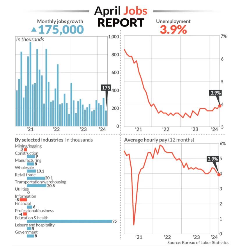 具体来看,4月美国非农就业人数为17.5万人,增幅为2023年10月来新低,较此前市场预计的24万人明显不及预期,较上月的31.5万人则下降超40%。