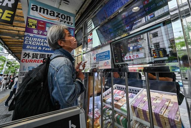 4月29日,一男子在东京一家货币兑换商的橱窗里看日元汇率 据视觉中国