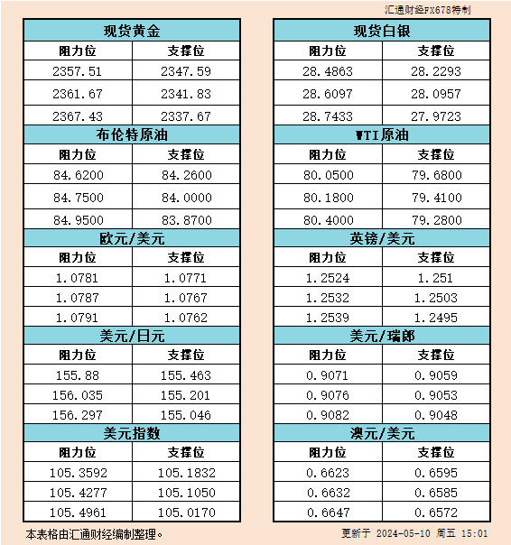 5月10日欧市支撑阻力:金银原油 美元指数等六大货币对
