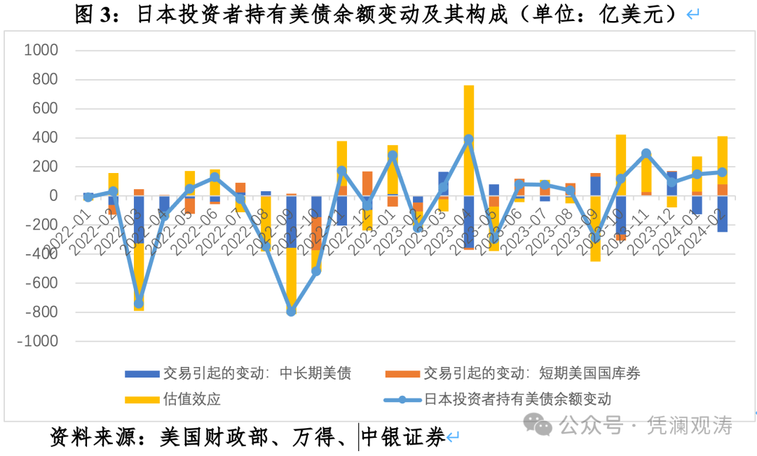 一方面,干预日元贬值的月份确实对应着日本投资者减持美债。美国财政部披露的国际资本流动报告(TIC)显示,2022年9月份,日资持有美债余额减少796亿美元,其中,净卖出美债339亿美元(包括净卖出中长期美债355亿美元,净买入短期美国国库券15亿美元),负估值效应457亿美元;10月份,日资持有美债余额减少520亿美元,其中,净卖出美债373亿美元(包括分别净卖出中长期美债和短期美国国库券145亿和228亿美元),负估值效应147亿美元。两个月,日资累计净卖出美债712亿美元,超出同期日本外汇干预规模近百亿美元,这与两个可能性有关:一是日本投资者还包括了私人投资者,同期后者也抛售了美债;二是日本央行为干预日元贬值,多抛美债、预留头寸。