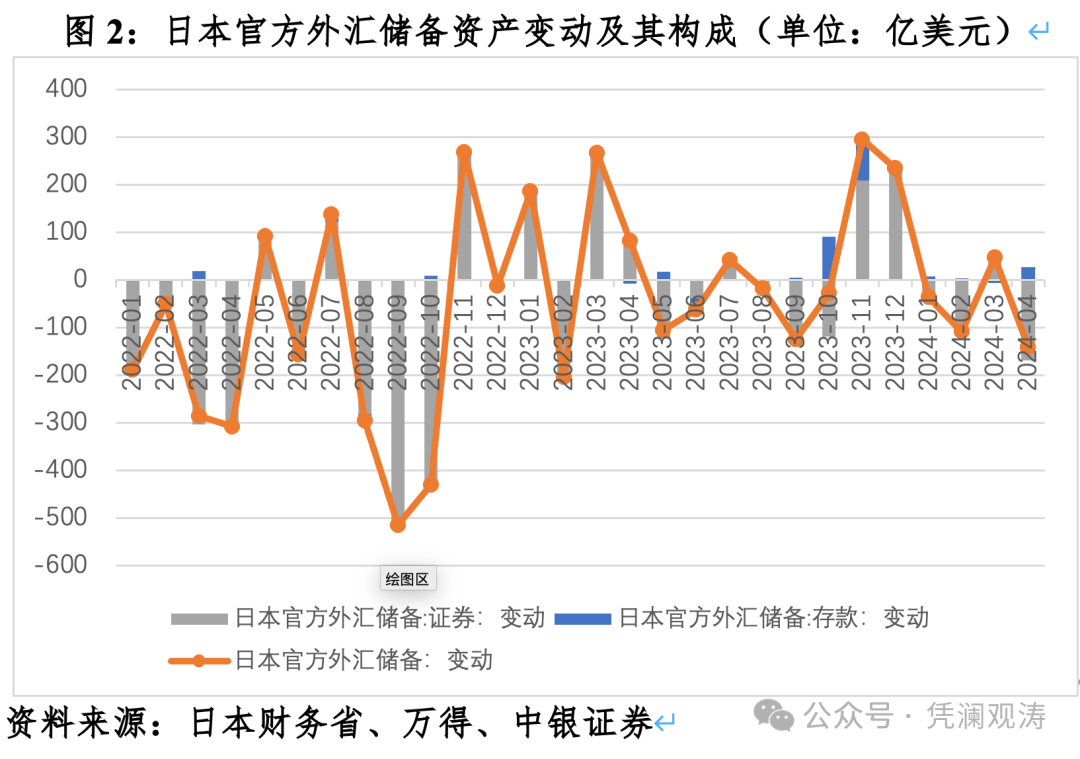 以2022年为例,当年9、10月份日本外汇储备分别减少515亿和430亿美元,合计减少945亿美元,远大于同期实际干预规模。二者缺口主要反映了当时美联储紧缩预期下,全球金融动荡引发的负估值效应。进一步分析当时日本外汇储备变动的结构:9月份,证券资产减少515亿美元,外汇存款未变;10月份,证券资产减少439亿美元,外汇存款增加9亿美元。可见,日本央行是直接出售证券资产获得干预所需的外汇资金,而不是动用外汇存款。