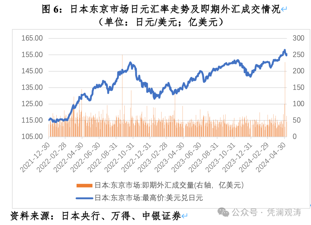 此外,日本央行的外汇干预不局限于在岸市场。2022年10月21日,日本外汇干预规模约合375亿美元,远超过当日东京市场即期外汇成交量89亿美元(环比增加40亿美元),显示这次干预应该是在境内外市场同时进行,且主场在离岸。2024年4月29日恰逢东京外汇市场因为昭和日闭市,当日外汇干预显然只能在离岸完成。5月2日,市场猜测干预规模约合220亿美元,与当日东京市场即期外汇成交量228亿美元过于接近,这表明要么是市场高估了日本央行的干预规模,要么就是日本央行同时在境内外市场实施了干预。