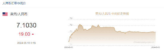 5月13日,人民币中间价报7.1030,下调19点,上一交易日中间价报7.1011。