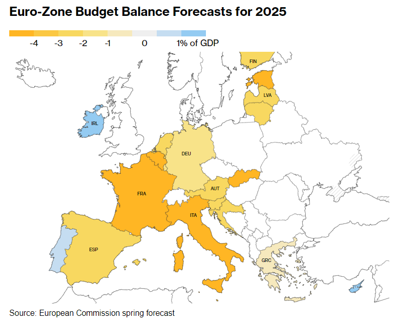 官员们预测,2024年和2025年的总预算赤字分别为3%和2.8%,高于此前的2.8%和2.7%。虽然法国和意大利目前面临更大的缺口,但德国和西班牙预计将面临较小的缺口。