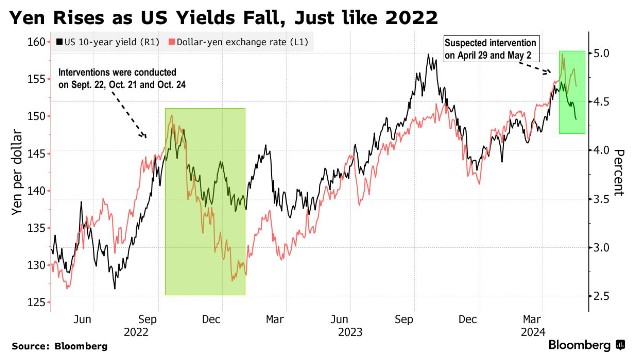 日元近几周大幅波动,在4月底跌破1美元兑160日圆,为1990年以来首见,之后日本当局疑似进行了两轮干预,刺激日元暂时上涨。日元的反弹表明,尽管日本官员警告将采取干预措施,日本央行官员也暗示今年可能进一步加息,但最终美国的数据和政策才是推动日元反弹的主要因素。