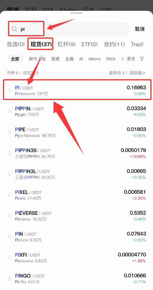 在左上角搜索并选择【PI/USDT】。