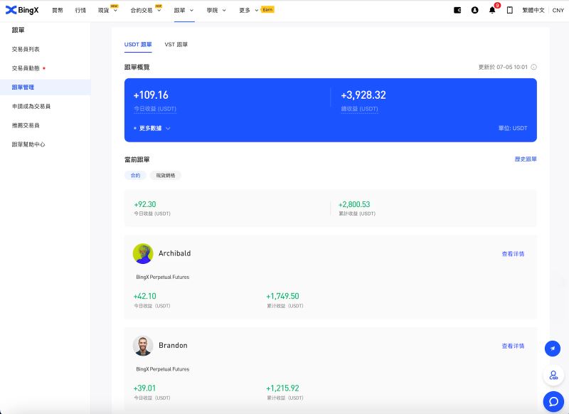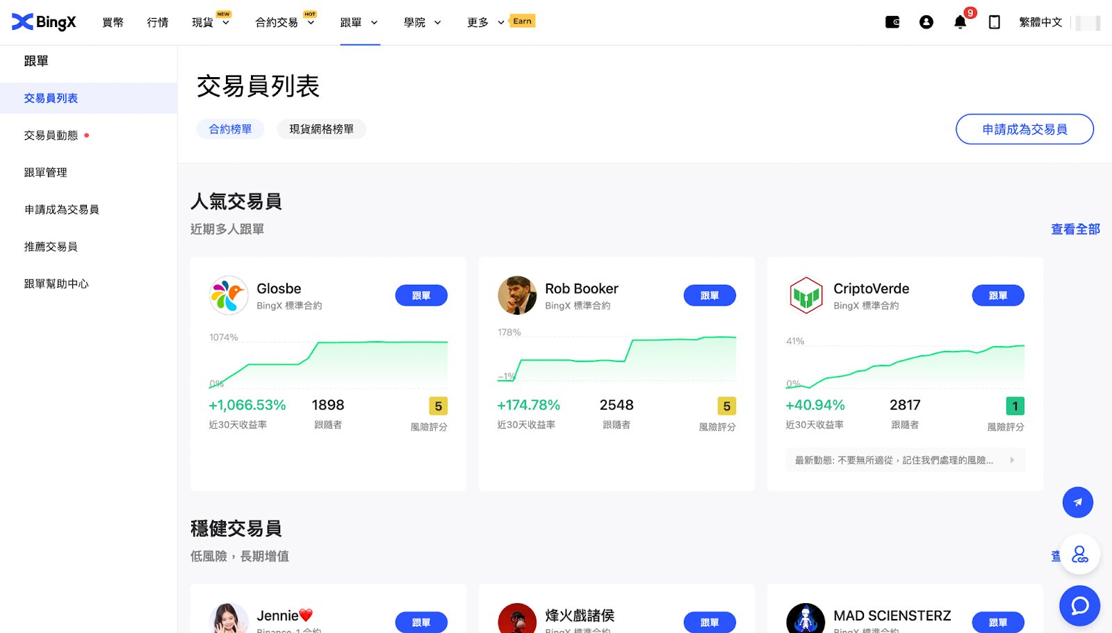 BingX 的主要特色在于其「社交交易」的定位。除了提供常见的现货和合约交易外,BingX 还推出了创新的跟单交易功能,让新手投资者可以轻松复制专业交易员的操作。