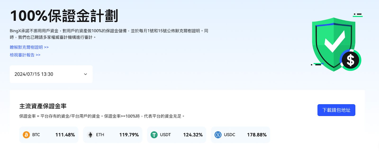 - 资产储备:BingX 提供 100% 的资产储备证明,并定期发布 Merkle Tree 报告。