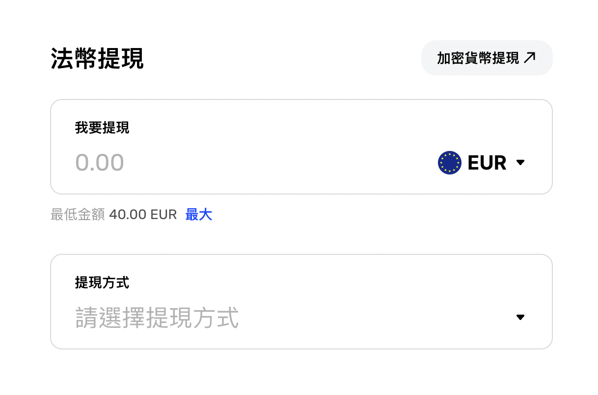 | EUR 出金 | SEPA | 2 EUR | 1-3 个工作日到帐 |