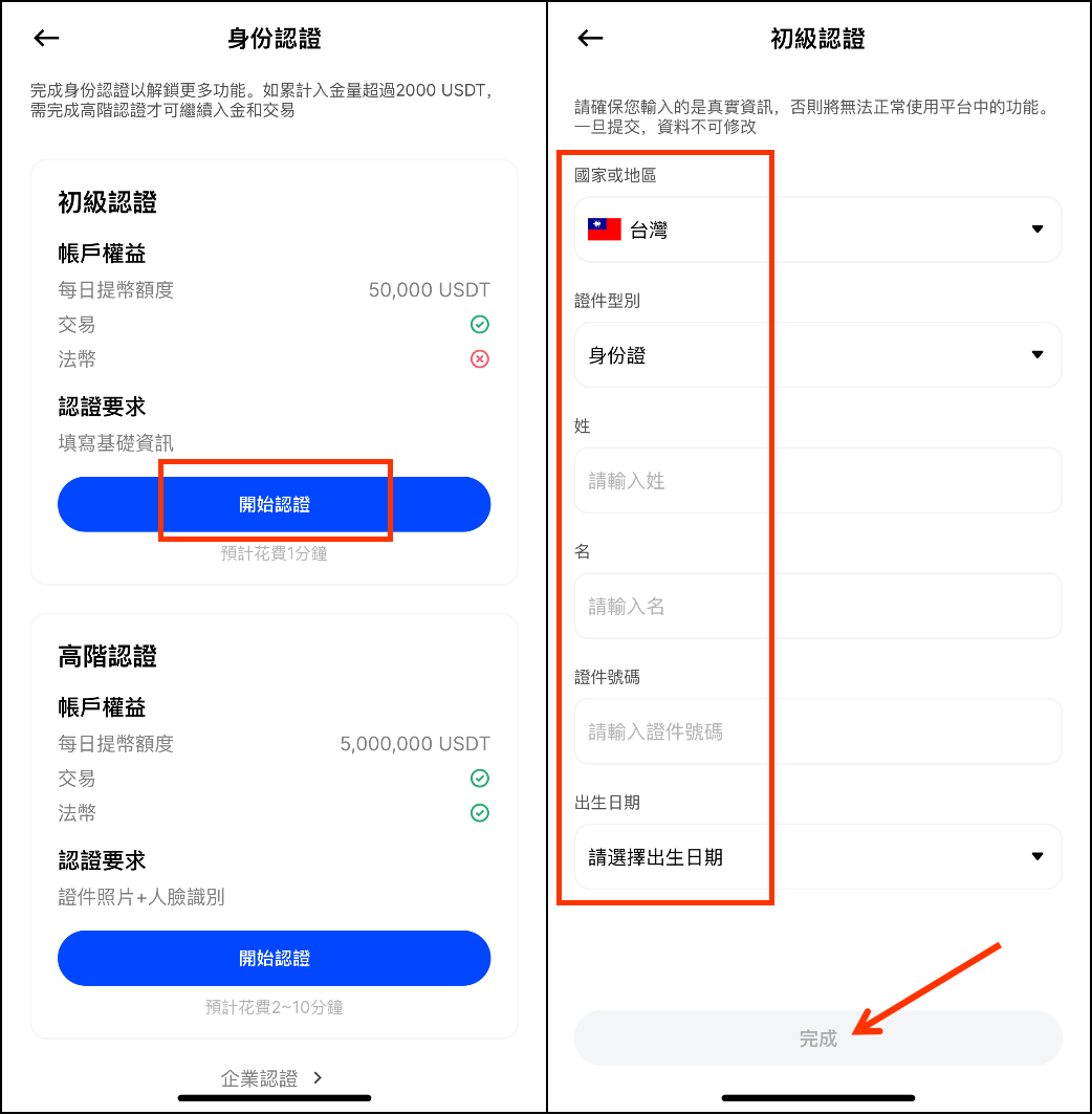 入金量超过 2000 USDT 即需要完成高级认证,建议一次跑完流程,此步骤仅需上传你的身份证或护照资料,并完成人脸验证