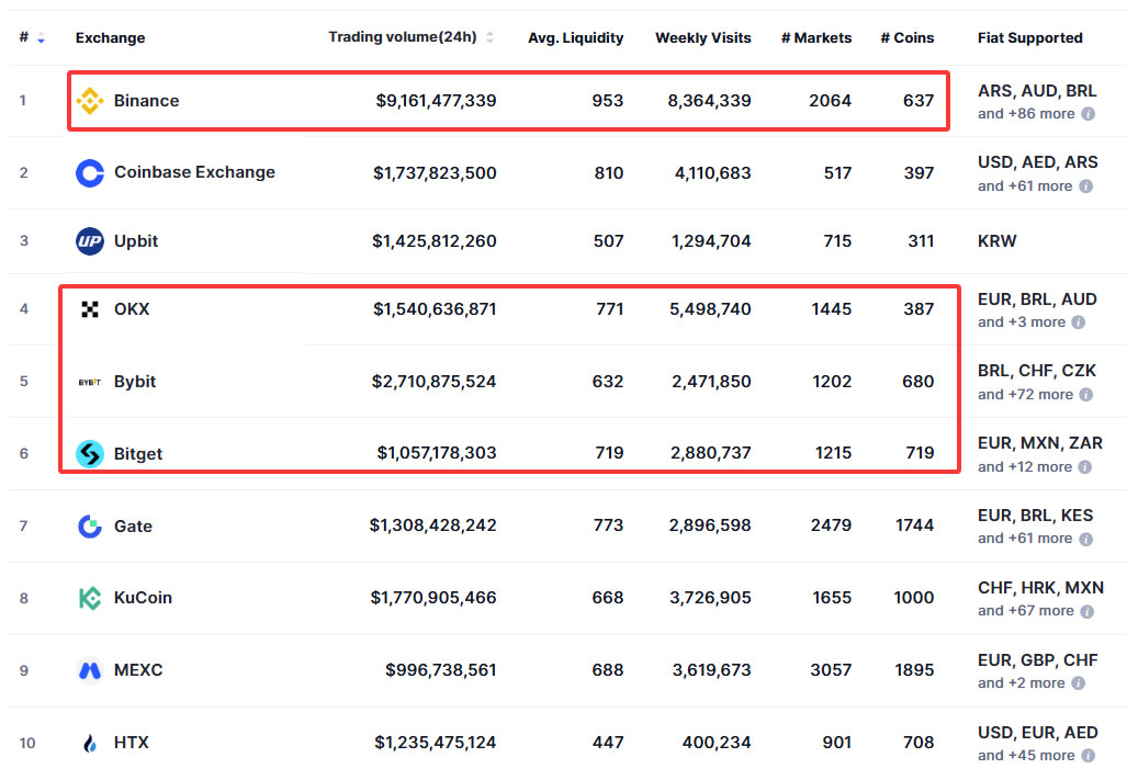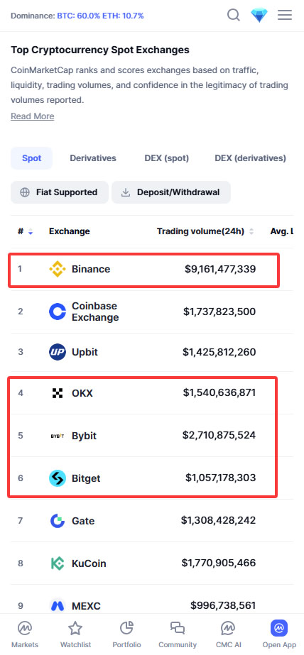 在Coinmarketcap网站上,点击左上角的「Exchange」,可以看到现货交易所排名。排除美国的Coinbase和韩国的Upbit(这两家对华人用户限制较多),前四名正好就是Binance、BYBIT、币安、Bitget。