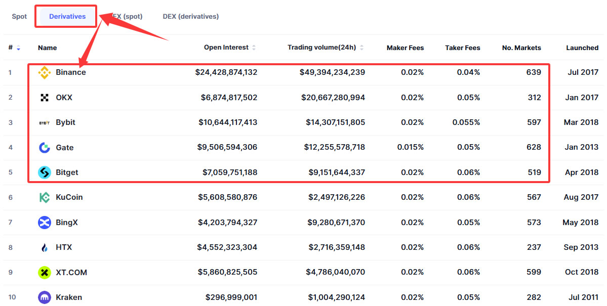 在衍生品(合约)部分,全球排名前四的就是币安、BYBIT、币安和Bitget,这个排名更加清晰。对于新手来说,用这四家交易所完全够用,不管是流动性还是安全性都很好。