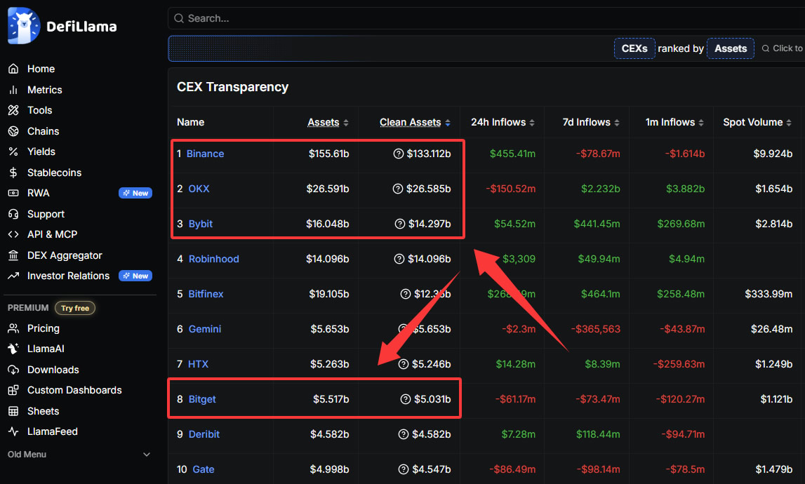 在DeFiLlama网站的中心化交易所资产透明度页面,可以看到各家交易所的沉淀资金情况: