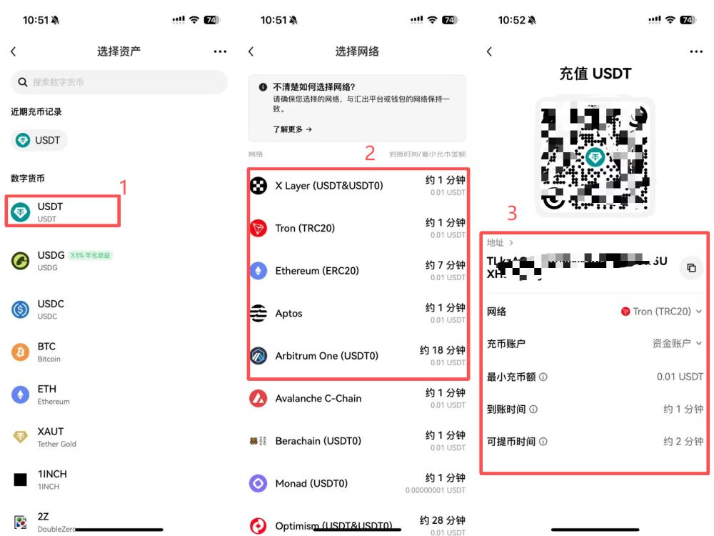 2、选择您需要充入的币种【USDT】—选择USDT可用的充币网络【USDT-ERC20/USDT-TRC20/USDT-币安TC】—【下一步】;注意:选择充值USDT币种时,此地址只能充入Tether(USDT),请勿充入其他币种,否则您充入的资产将无法找回。
