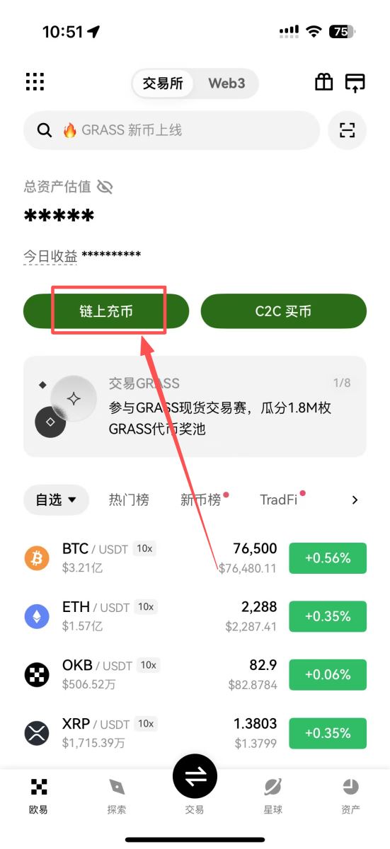 1、打开币安binance交易所官网并登录(点击注册),选择首页,点击链上充币